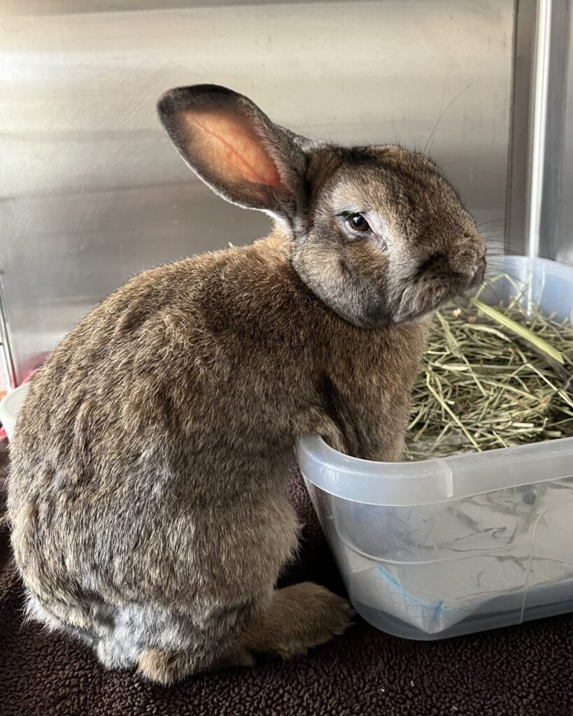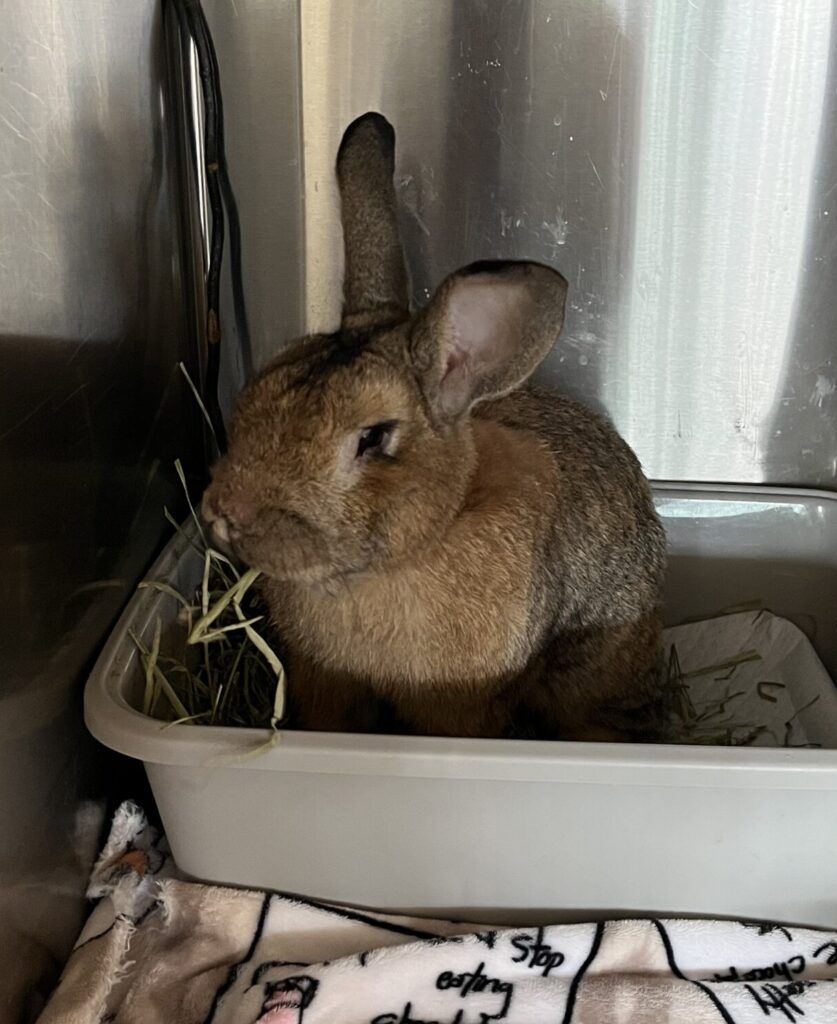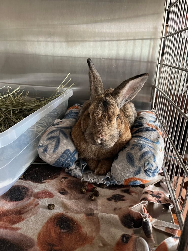 Bernie came to Avalon when nine rabbits were dumped in horrible condition.  He is covered with scars and part of his nose is missing.  His favorite thing to do is sleep in his flop bed.  Bernie is a big hunk of love!
