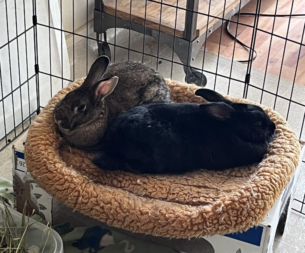 Luna (black) and Doe (agouti) are still looking for their forever family.  These sisters/best friends were found outside when they were just a few weeks old and have grown up together.  Look to Luna to find the brave bun of the duo.  She is very smart and loves to explore.  Doe may be the shy sister, but she is always right by Luna’s side ready to get into trouble.