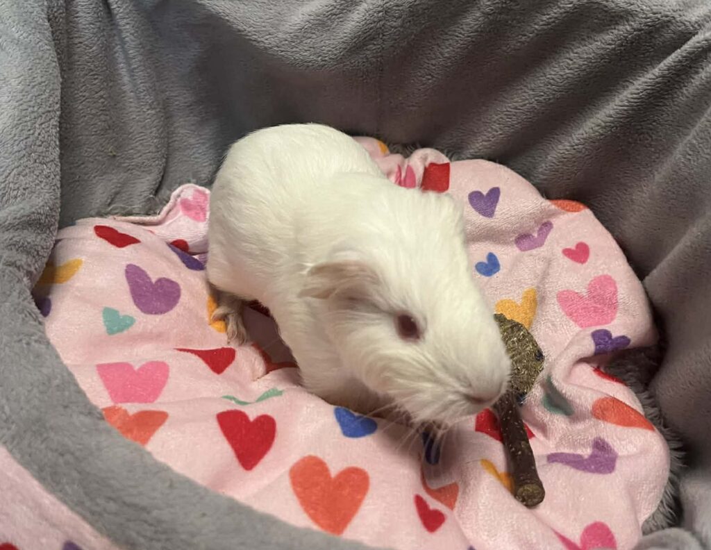 Georgina was rescued with a group of 15 guinea pigs found outside in McMinnville.  She almost immediately gave birth to Jasper and Opal.